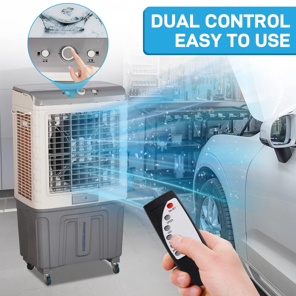 The portable swamp cooler provides powerful cooling by harnessing the natural process of water evaporation to lower temperatures efficiently. Designed for indoor and outdoor use, this portable evaporative cooler features adjustable fan speeds and a large water tank for extended cooling.