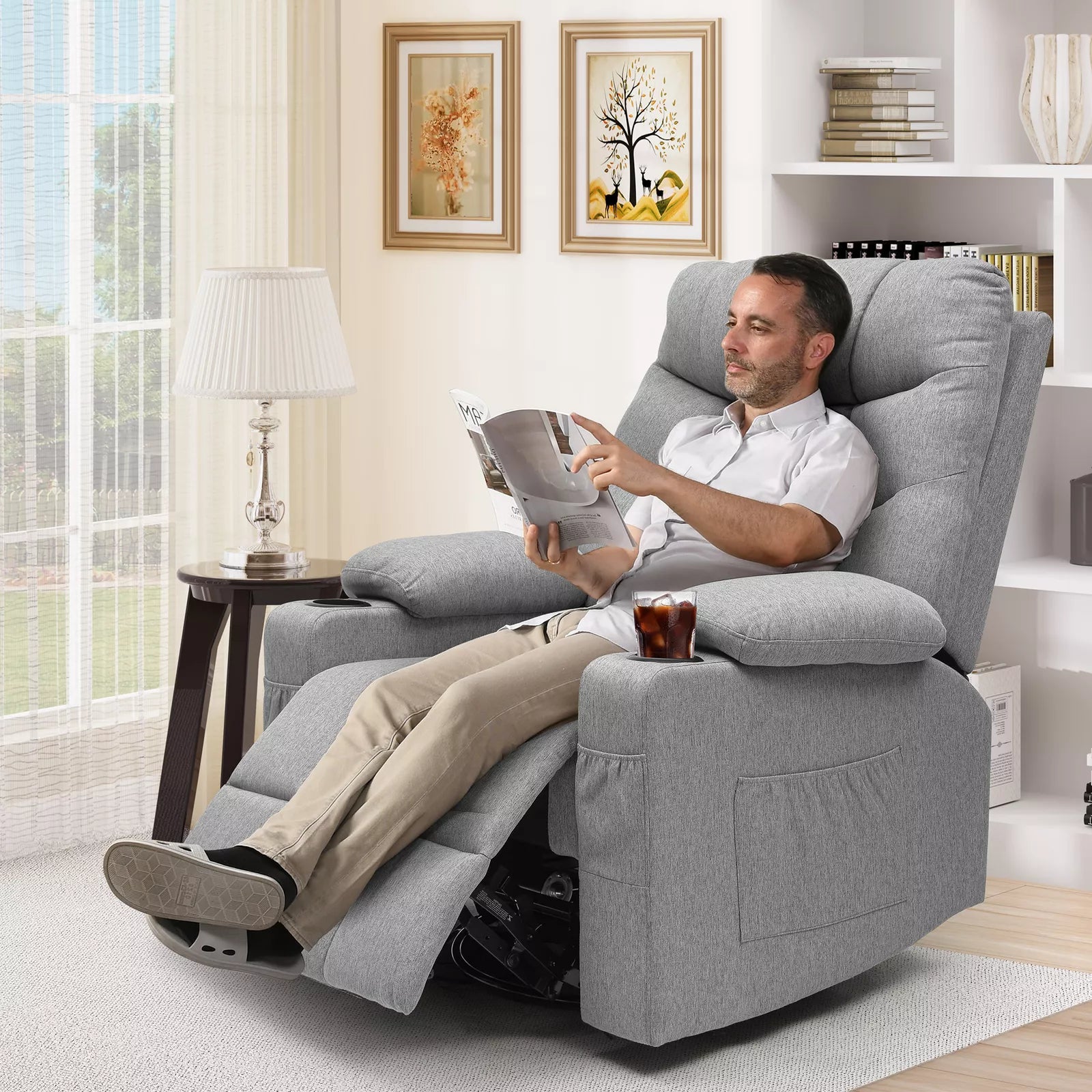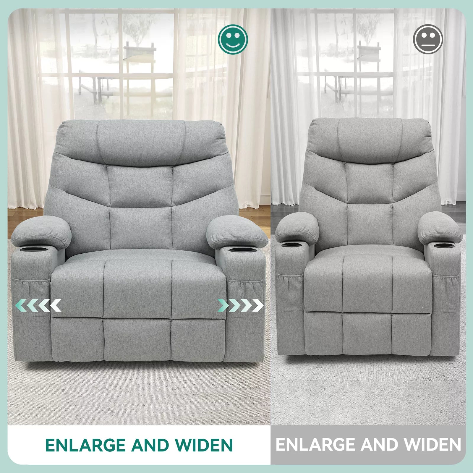 This wide recliner's durable construction and smooth reclining mechanism ensure long-lasting use and effortless operation. Elevate your home decor with our spacious and stylish large recliner chair, perfect for unwinding after a long day.